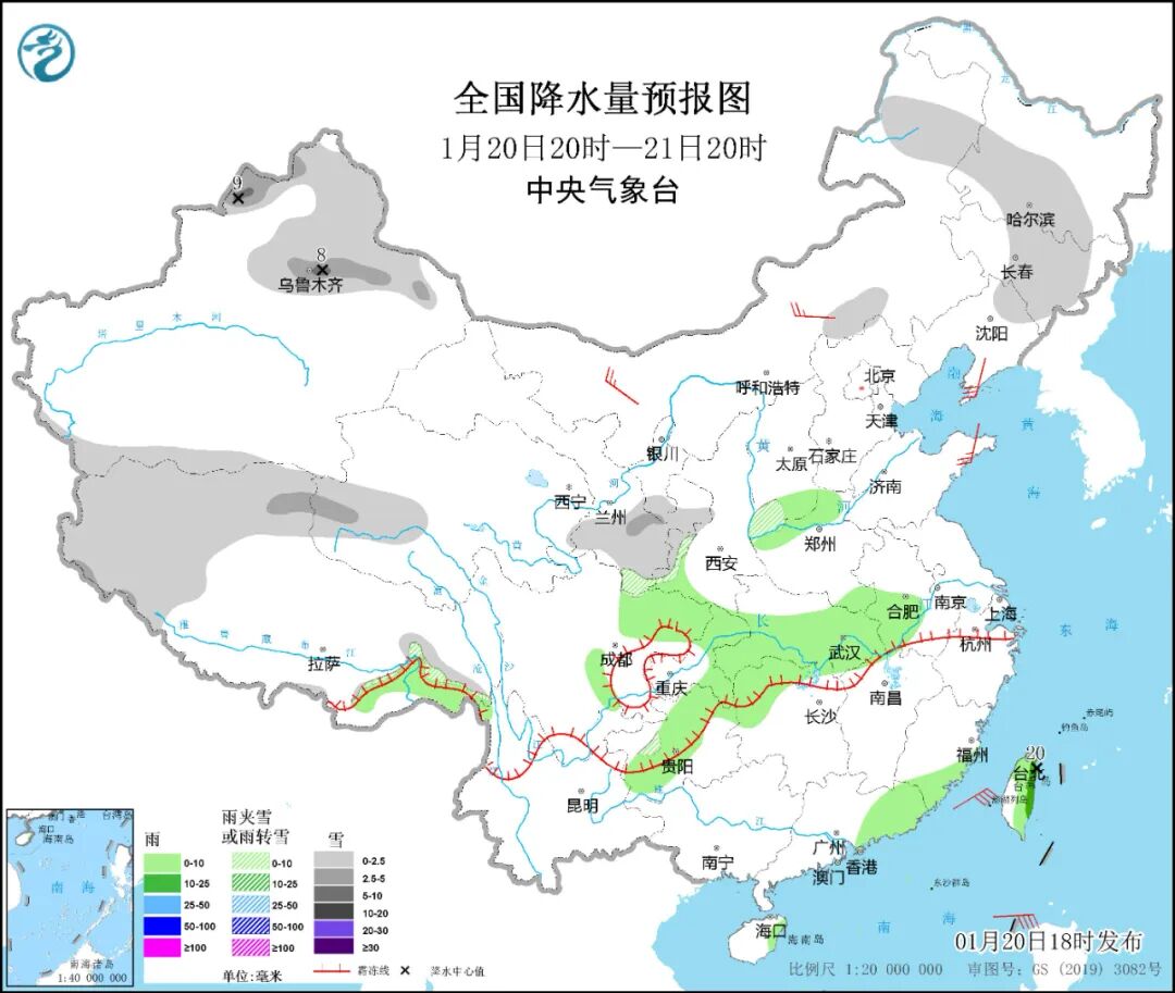 中央气象台预计,20日20时至21日20时,内蒙古东北部、黑龙江中南部、吉林中东部、山西西南部、甘肃南部、新疆北部、青海西南部、西藏西部和北部等地部分地区有小到中雪或雨夹雪,其中,新疆北疆西部和沿天山地区等地部分地区有大雪;山西南部、安徽南部、湖北、湖南北部、贵州北部和西部、四川盆地北部和东部、福建南部、广东东部、台湾岛东部等地部分地区有小雨,其中,台湾岛东部等地部分地区有中雨。