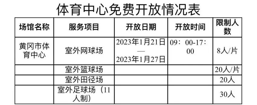 为进一步贯彻落实《全民健身基本公共服务标准(2021年版)》和《公共体育场馆基本公共服务规范》相关政策,满足广大市民健身需求,鼓励市民积极参与全民健身活动,黄冈市体育中心决定将室外所有训练场地在春节期间实行免费对外开放,开放项目和时间如下: