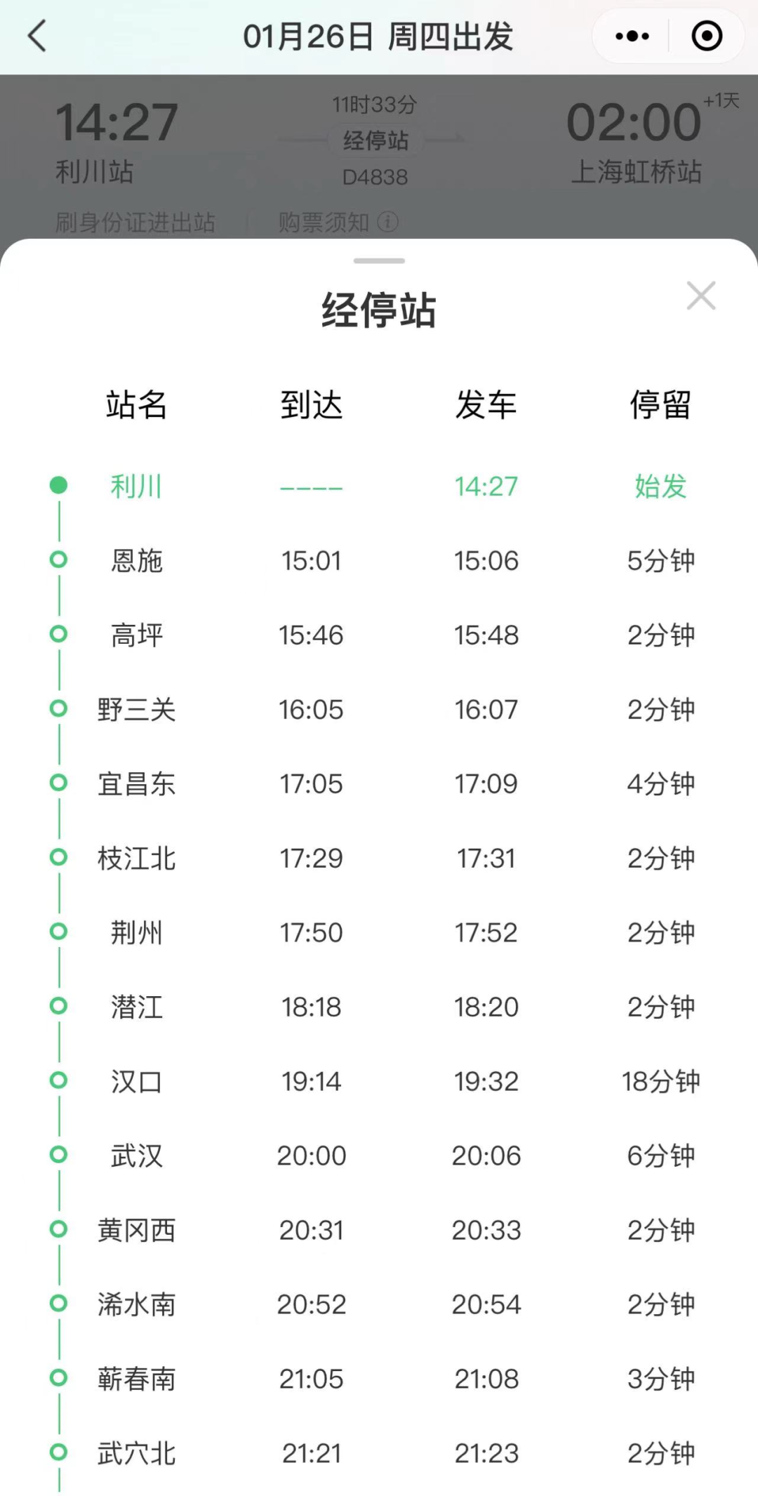 2023年1月26日-30日,2月6日-2月7日增开利川-上海虹桥D4838/5