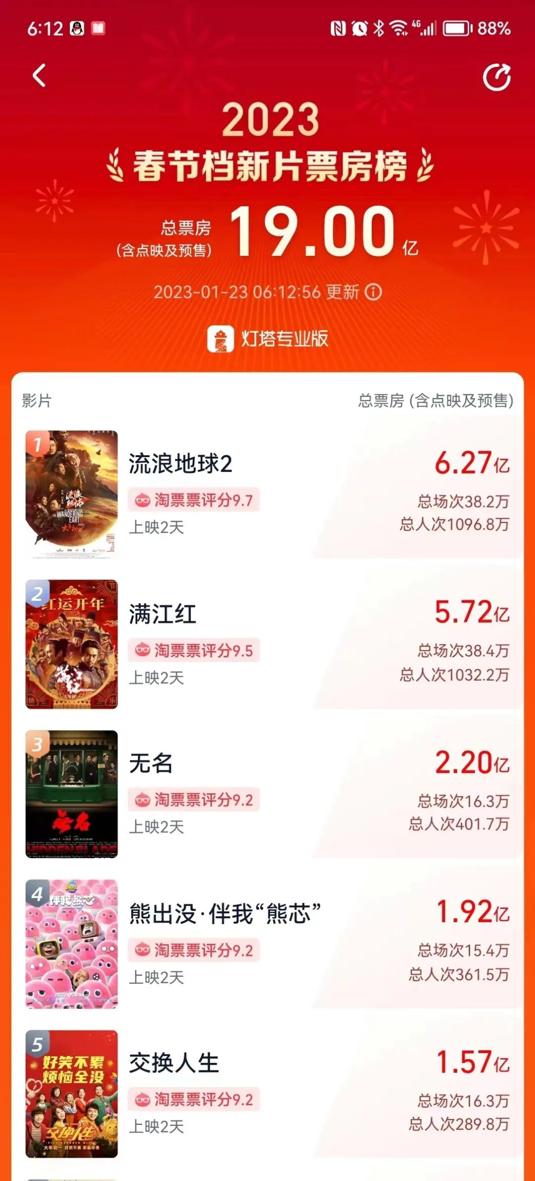 据灯塔专业版实时数据,1月23日06时12分,2023春节档(1月21日-1月27日)总票房突破19亿元(含点映及预售),《流浪地球2》票房超6亿,《满江红》超5亿。