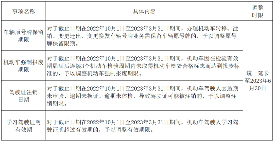 一、统一延长车辆原号牌保留期限。对于截止日期在2022年10月1日至2023年3月31日期间,办理机动车转移、注销、变更迁出、变更换发车辆号牌业务需保留车辆原号牌的,原号牌保留期限统一延长至2023年6月30日。