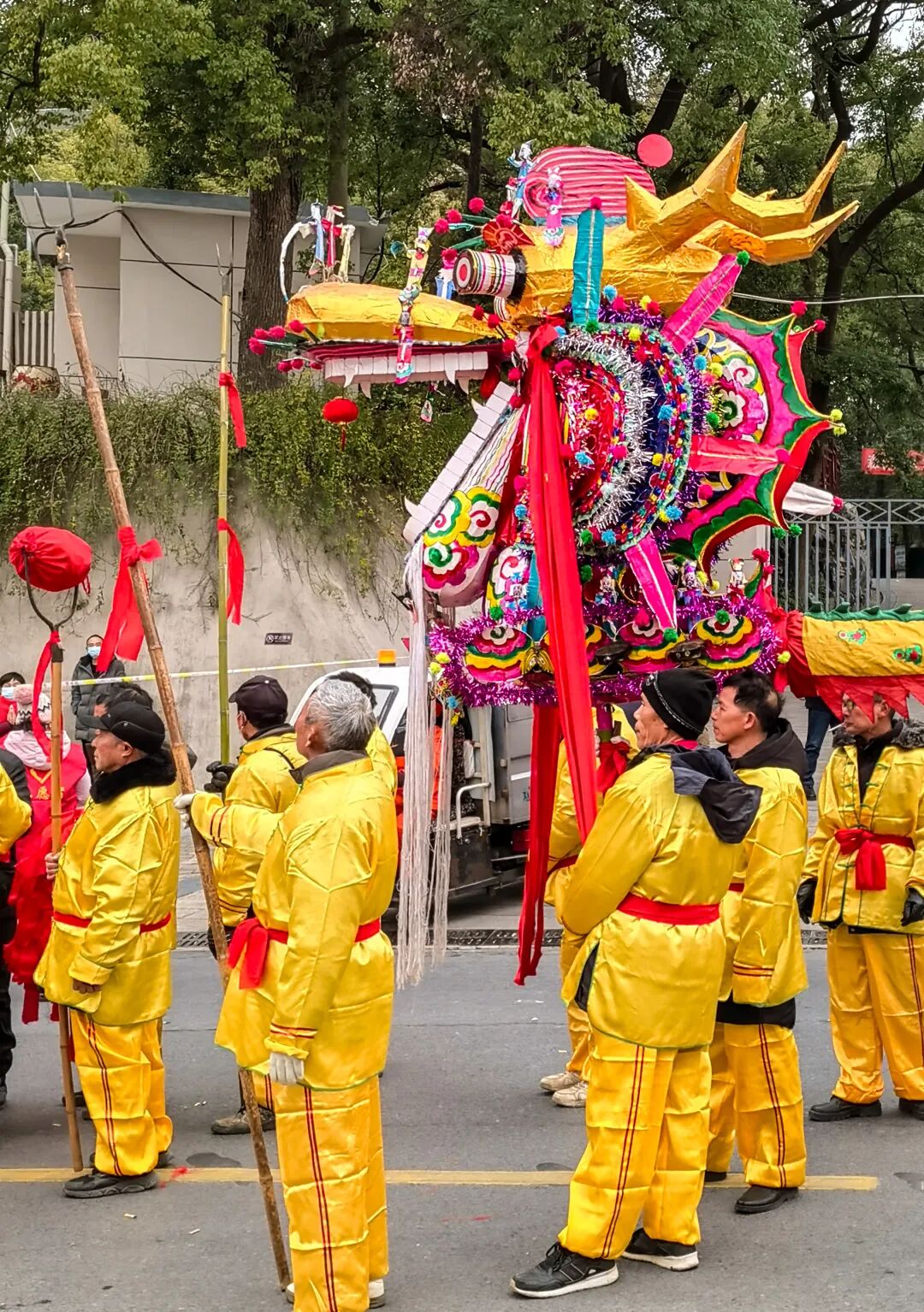 随后,数条“巨龙”翻飞腾舞,沿着东门路、遗爱湖大道、赤壁大道等路段巡游。神态各异的彩龙随着龙珠上下翻腾,时而“盘龙昂首”,时而“翻江倒海”,交相呼应,活灵活现,各显风采。无数小孩、大人随着巡游队伍的脚步一路前行,欢欢喜喜闹新春。
