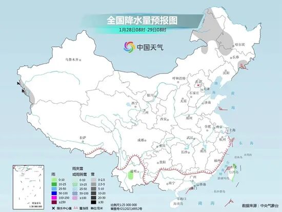 28日,新疆南疆西部高海拔山区、内蒙古东北部、黑龙江西南部、吉林东部和西部等地部分地区有小到中雪。云南中部、台湾岛东部等地局地有小雨。