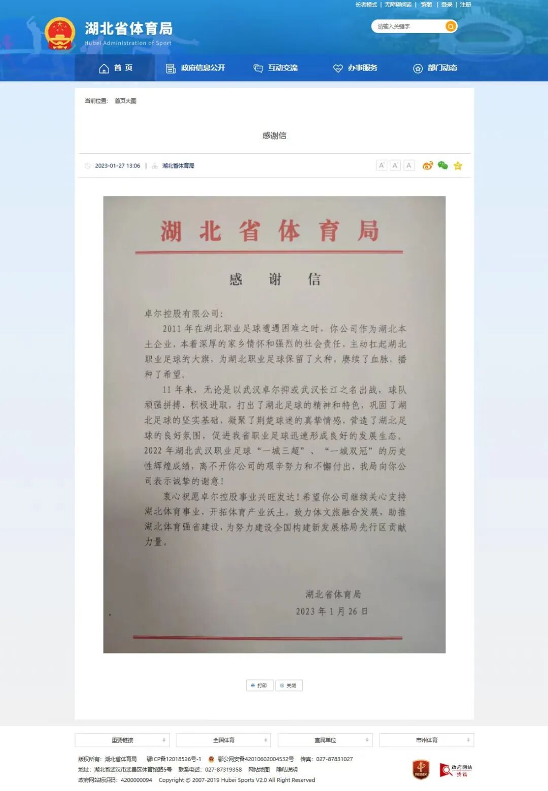 衷心祝愿卓尔控股事业兴旺发达!希望你公司继续关心支持湖北体育事业,开拓体育产业沃土,致力体文旅融合发展,助推湖北体育强省建设,为努力建设全国构建新发展格局先行区贡献力量。