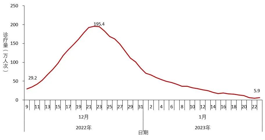 图2-2 全国农村地区乡镇卫生院发热门诊(诊室)就诊人数变化趋势 (数据来源于31个省(区、市)及新疆生产建设兵团报告) 说明:农村发热患者诊疗量为乡镇卫生院发热诊室诊疗量(不含村卫生室) (三)城市发热门诊就诊人数结果。全国二级以上医疗机构和城市社区卫生服务中心发热门诊(诊室)就诊人数于2022年12月22日达到峰值195.4万人次,随后连续下降,2023年1月23日下降至5.9万人次,较峰值下降了97.0%(图2-3)。