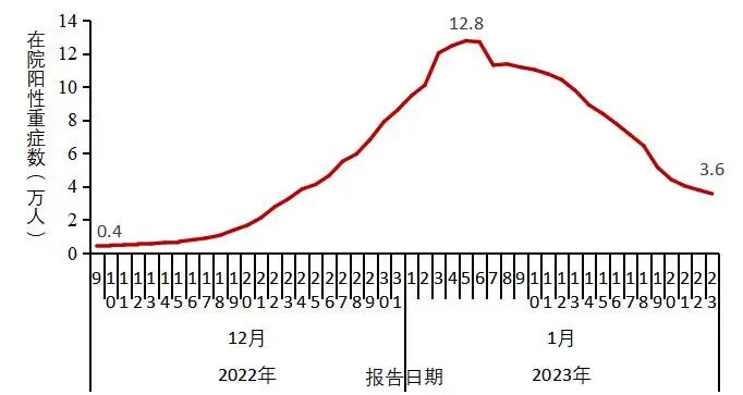 图3-1 全国在院新冠病毒感染者每日变化情况 (数据来源于31个省(区、市)及新疆生产建设兵团报告)(二)在院新冠病毒感染阳性重症患者结果。全国在院新冠病毒感染者中,重症患者数量于2022年12月27日至2023年1月3日期间每日增量近1万,1月4日增量明显下降,1月5日达到峰值12.8万,随后持续下降,1月23日下降至3.6万,较峰值下降了72.0%(图3-2)。