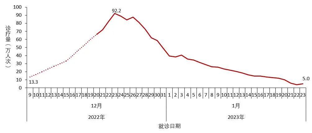 图2-1 全国发热门诊(诊室)诊疗人数变化趋势 (数据来源于31个省(区、市)及新疆生产建设兵团报告) 说明:自2022年12月9日起,监测二级以上医疗机构发热门诊诊疗量;12月21日起,增加监测社区卫生服务中心和乡镇卫生院发热诊室诊疗量(不含村卫生室和社区卫生服务站)。 (二)农村发热门诊就诊人数结果。全国乡镇卫生院发热门诊(诊室)就诊人数于2022年12月23日达到峰值92.2万人次,随后波动下降,2023年1月23日下降至5.0万人次,较峰值下降了94.6%(图2-2)。