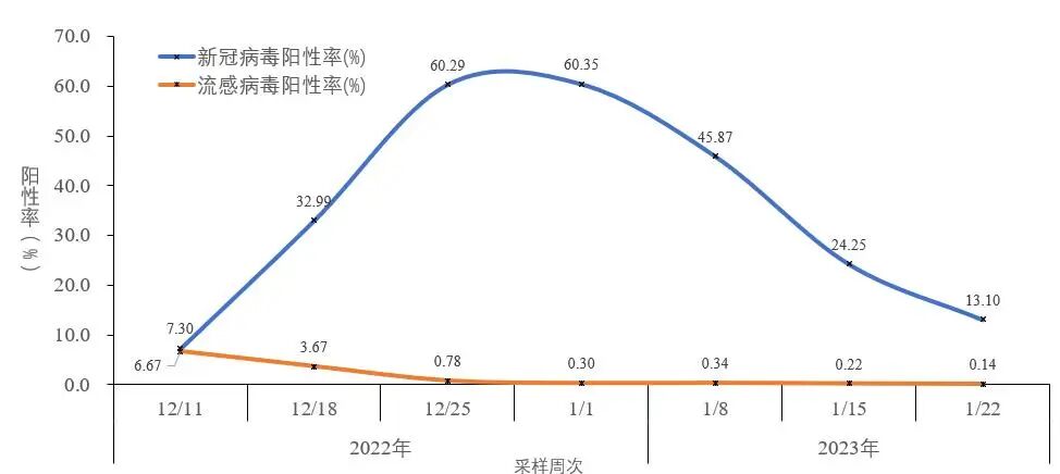 网络实验室对流感样病例标本同时进行新冠病毒和流感病毒检测,从2022年第49周(12月9日),新冠病毒阳性率开始逐渐增加,在第51和52周期间达峰值后开始波动下降;同期流感病毒阳性率则逐步降低,至12月下旬降至极低水平(图2-5)。