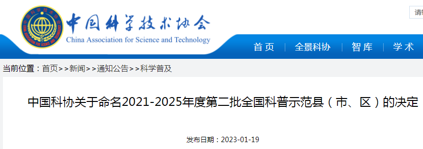 1月19日中国科协印发文件公布2021-2025年度第二批全国科普示范县(市、区)名单湖北这些地方上榜↓↓↓