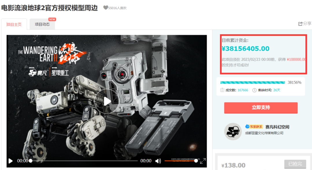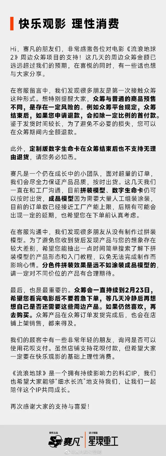 作为此次众筹产品的提供方,赛凡科幻空间近日发文称,在看到人们如此高的热情后,呼吁大家理性消费,建议大家在观看完电影之后冷静几天再购买。