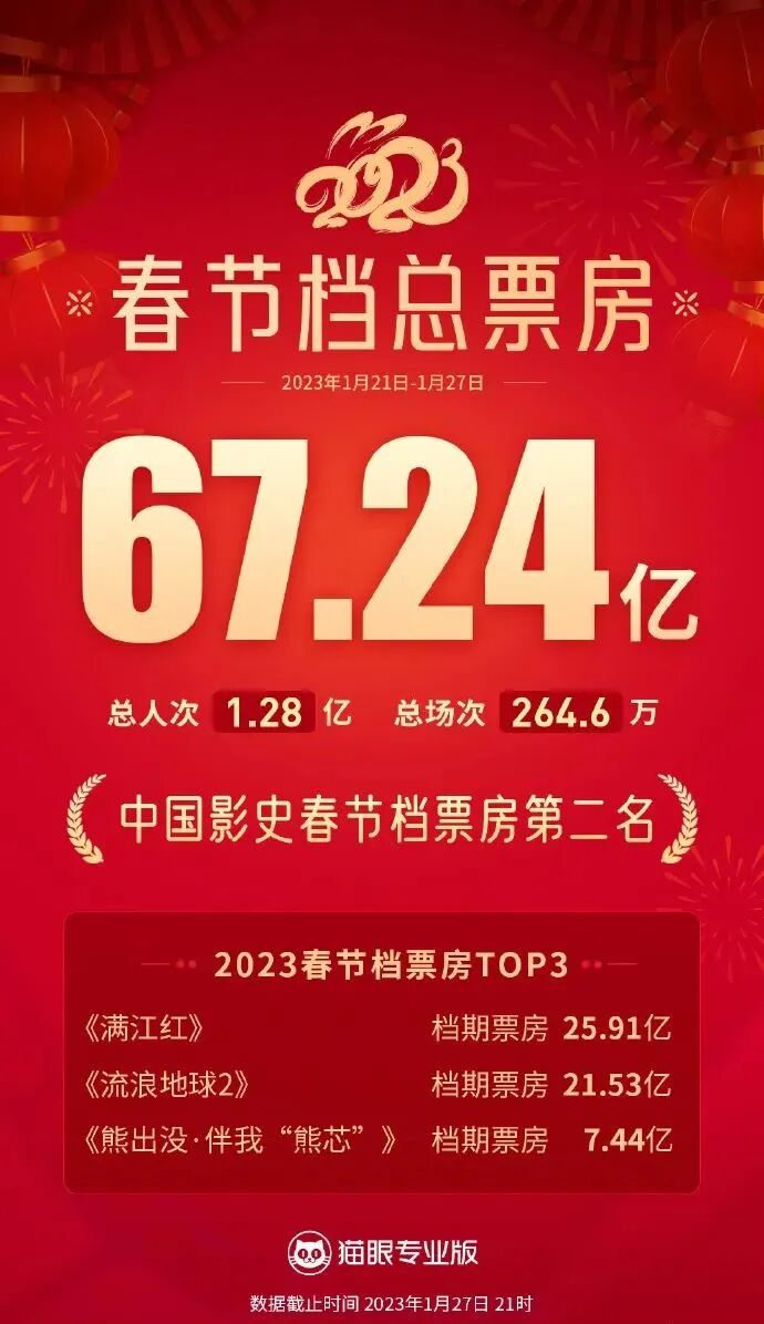 据猫眼专业版数据显示,截至1月27日21时,2023年春节档期总票房67.24亿,位列中国影史春节档票房榜第二位。总人次1.28亿,总场次264.6万,平均票价52.4元。共2部电影票房破20亿。春节档期票房前三名分别为:《满江红》档期票房25.91亿 、《流浪地球2》档期票房21.53亿 、《熊出没·伴我“熊芯”》 档期票房7.44亿。