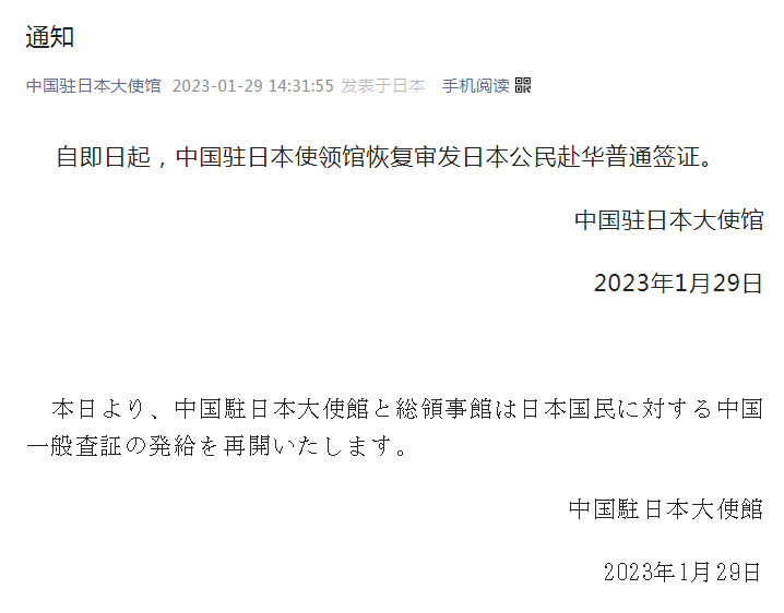 据中国驻日本大使馆微信公众号29日消息,自即日起,中国驻日本使领馆恢复审发日本公民赴华普通签证。