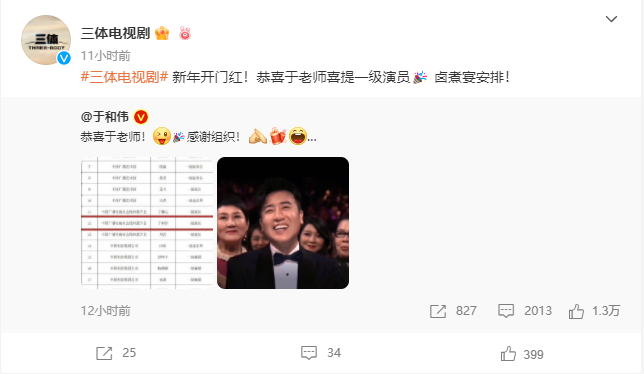 于和伟参演的热播电视剧《三体》官方微博也送上祝福:新年开门红!恭喜于老师喜提一级演员,卤煮宴安排!