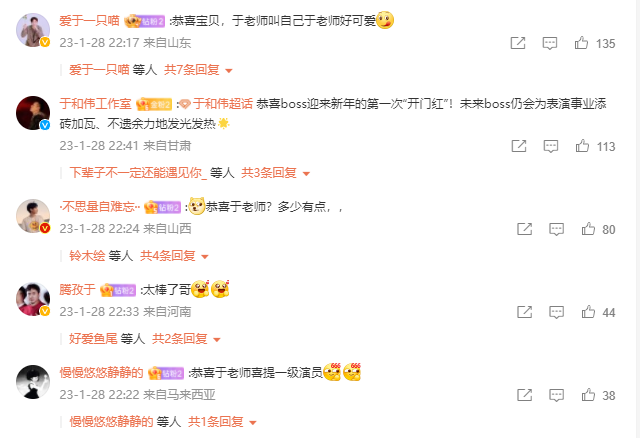 网友们纷纷向于和伟表示恭喜,并表示“于老师叫自己于老师好可爱。”
