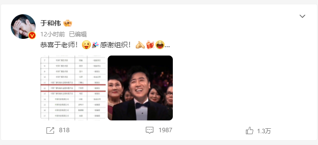 消息公布后的1月28日晚10点,于和伟迅速在微博上发文回应:恭喜于老师,感谢组织!并配上了一张自己大笑的图片和公示名单。