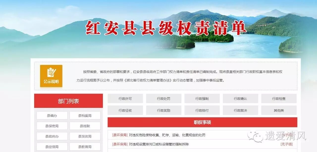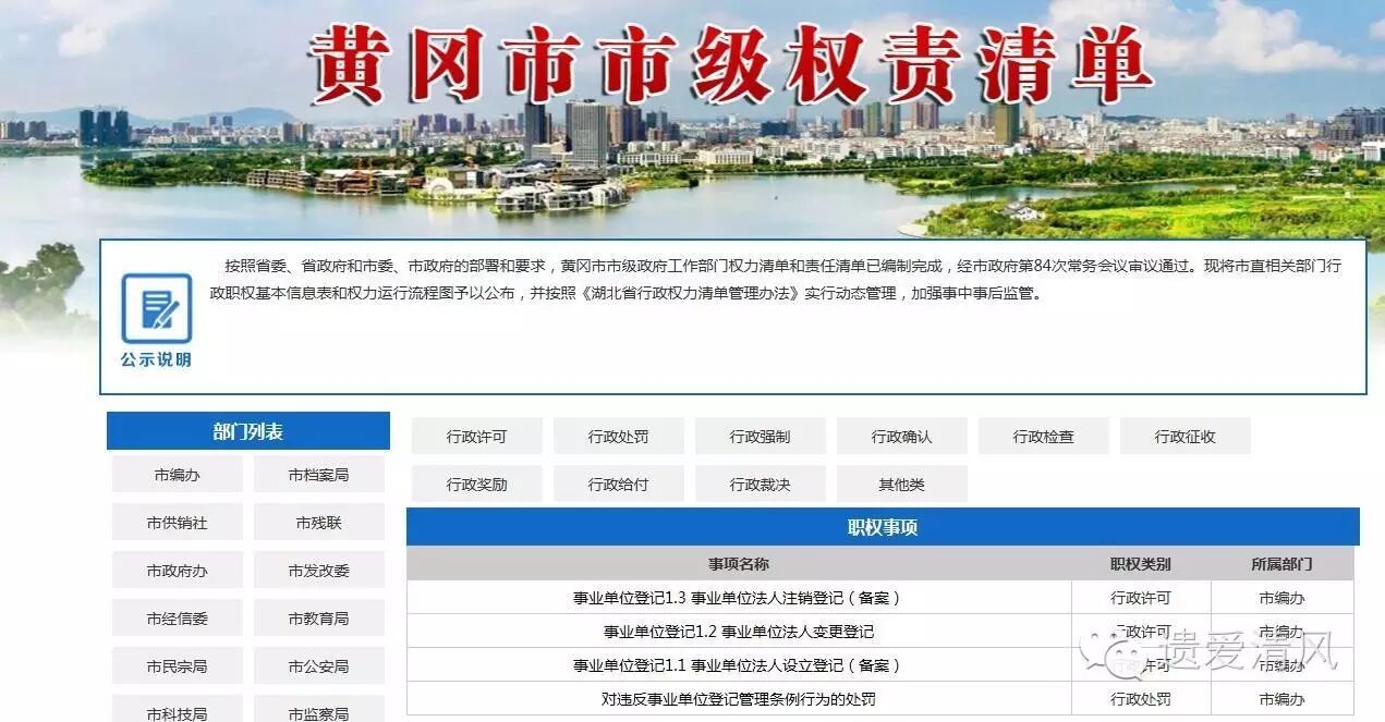 11月20日,红安县政府工作部门权责清单在红安县政府门户网站公布,这标志着黄冈市本级及所辖10个县(市、区)政府工作部门权责清单全部面向社会公布。