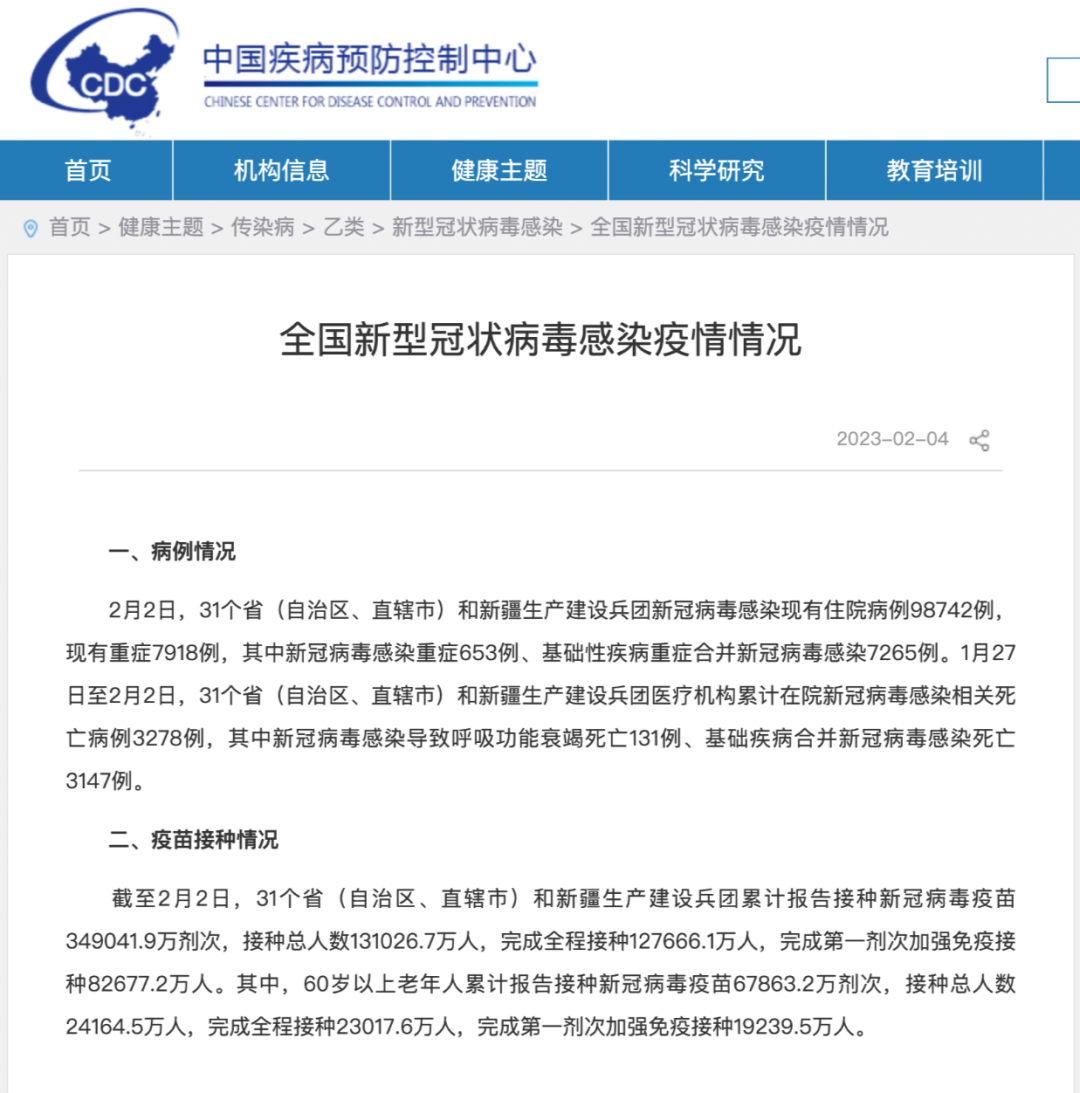 2月2日,31个省(自治区、直辖市)和新疆生产建设兵团新冠病毒感染现有住院病例98742例,现有重症7918例,其中新冠病毒感染重症653例、基础性疾病重症合并新冠病毒感染7265例。1月27日至2月2日,31个省(自治区、直辖市)和新疆生产建设兵团医疗机构累计在院新冠病毒感染相关死亡病例3278例,其中新冠病毒感染导致呼吸功能衰竭死亡131例、基础疾病合并新冠病毒感染死亡3147例。