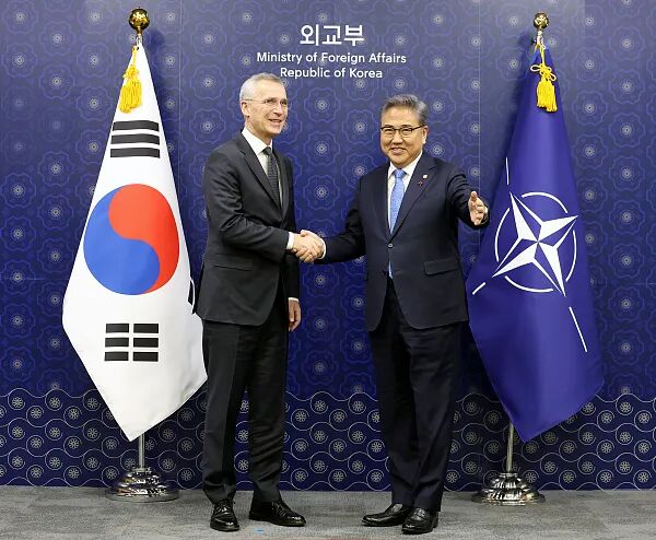 当地时间2023年1月29日,韩国首尔,韩国外交部长朴振(右)在外交部与北约秘书长延斯·斯托尔滕贝格握手。图/视觉中国