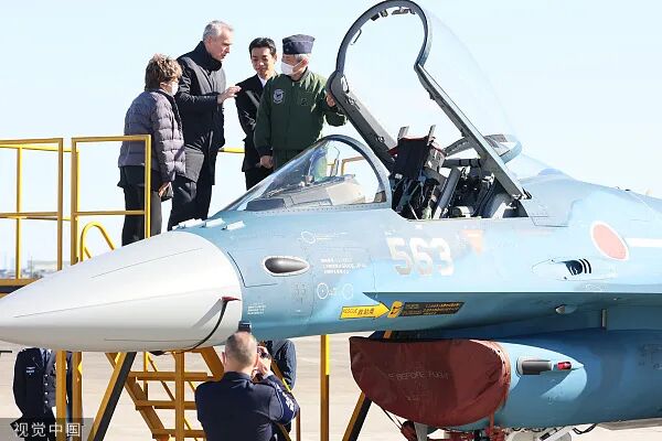 当地时间2023年1月31日,日本狭山,北约秘书长延斯·斯托尔滕贝格(左二)视察日本航空自卫队的入间空军基地。图/视觉中国