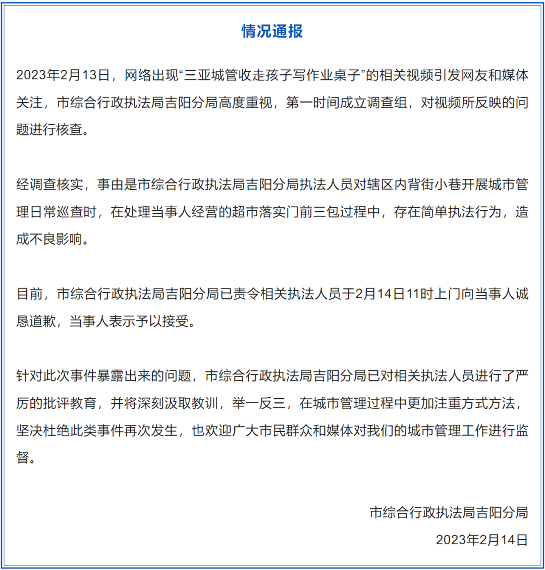 14日,海南三亚市综合行政执法局吉阳分局对于“三亚城管收走孩子写作业桌子”事件发布情况通报,称存在简单执法行为,已责令相关执法人员道歉。