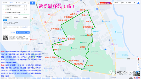 南向:梅园—江柳摇村—市图书馆—纽宾凯酒店—省黄梅戏剧院—教育小区—西湖安居小区东门—育英学校—市人社局—红卫小区—东坡外滩—黄冈科技职院—遗爱湖公园—市中级法院—市教育局—贵宾楼—东坡小学—西湖村—新港路派出所—梅园