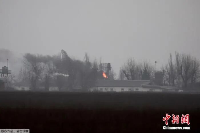 当地时间2022年2月24日,乌克兰马里乌波尔机场附近的一处军事设施起火。