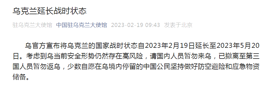 据中国驻乌克兰大使馆微信公众号19日消息,乌官方宣布将乌克兰的国家战时状态自2023年2月19日延长至2023年5月20日。考虑到乌当前安全形势仍然存在高风险,请国内人员暂勿来乌,已撤离至第三国人员暂勿返乌,少数自愿在乌境内停留的中国公民坚持做好防空避险和应急物资储备。