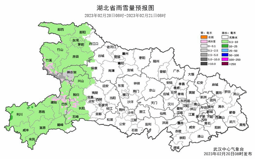 鄂西南阴天有小到中雨;其他地区阴天有小雨。西部高海拔地区有雨夹雪或小雪。