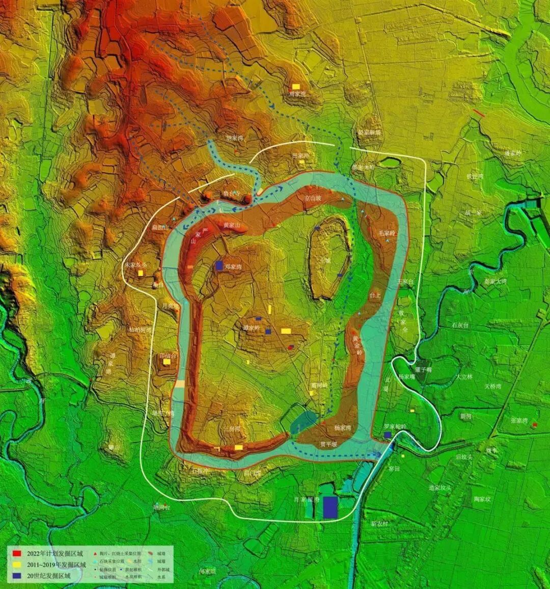 与石家河遗址大体同时期的良渚遗址,借助地理信息系统方法制作数字高程模型,成功找到良渚古城的外郭。此次石家河城址考古借鉴此工作方法,加大最新科技考古手段的应用,与武汉大学、中国地质大学多个团队合作,开展地球科学、测绘、水利等多学科调查研究。 经大量实地调查、勘探及局部试掘,考古团队发现,沿城壕(护城河)外侧分布着一些高岗,连起来大体绕城壕(护城河)一圈,且与石家河古城是同时期文化遗存。由此认定扁担山、朱家坟头、三星台、月亮坡等高岗属石家河古城的外郭。