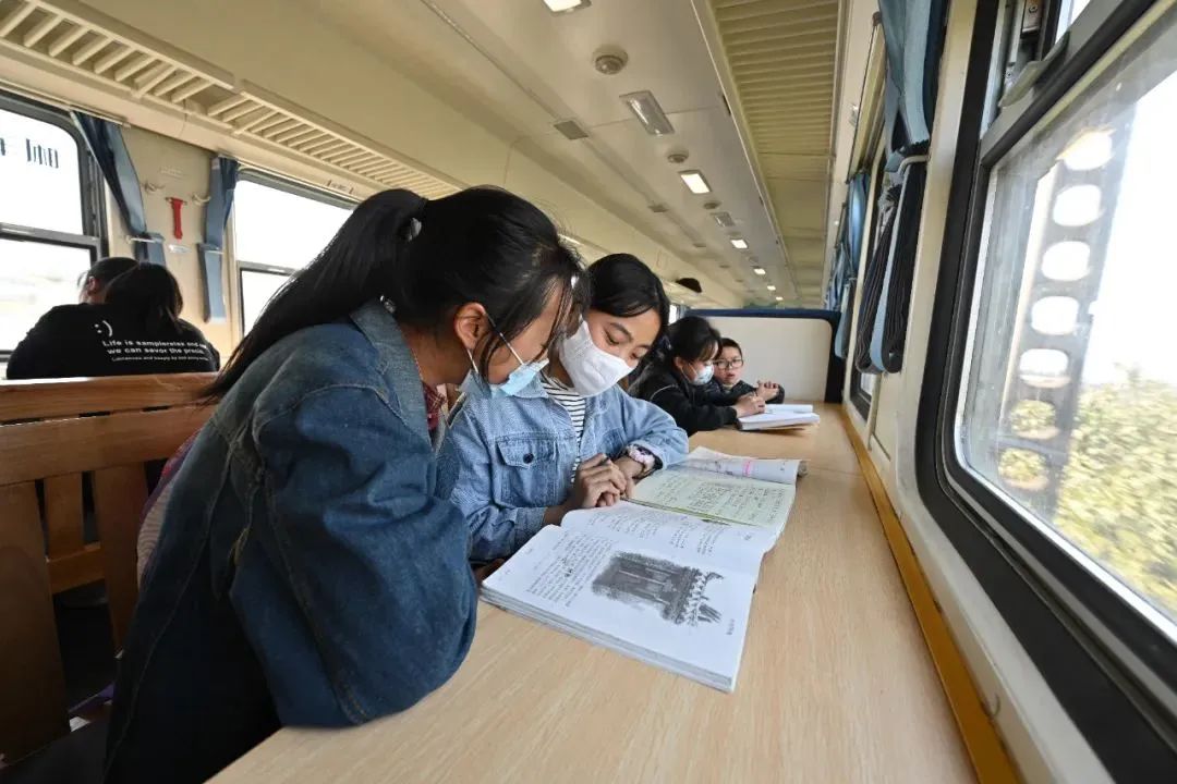 成昆铁路沿线有许多学校每到周五、周日学生们就会乘坐“慢火车”往返家与学校“慢火车”成为了他们的“校车”许多学生们利用乘车时间完成作业、复习课本、讨论知识点等以前,学生们在座位上学习如今,“学习车厢”为他们提供了更加宽敞、明亮的学习场所