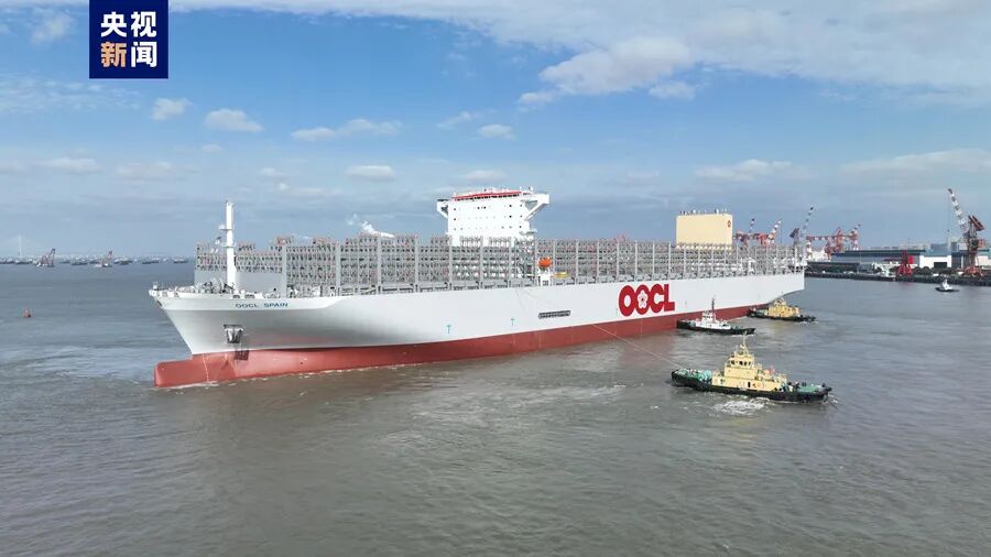 21日,我国建造的新一代高性能超大型集装箱船“中远川崎335”轮,在长江引航中心5名引航员的引领下,从江苏南通出江试航。