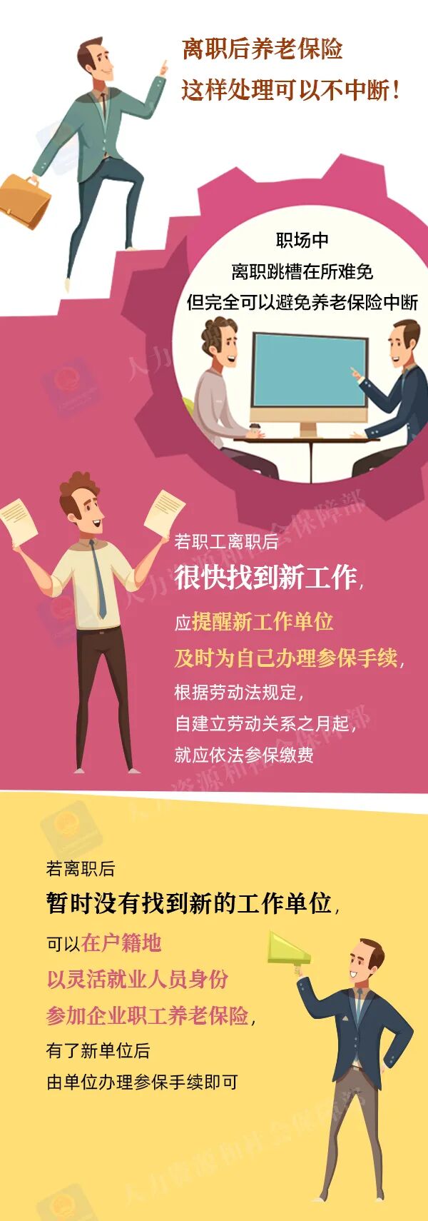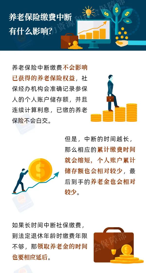 “跳槽到新公司 养老保险断缴了几个月 会影响以后领养老金吗? “还没找到心仪的工作 该怎么避免断缴? 由于换工作等原因 大家可能会面临 养老保险缴费中断的问题 离职以后 要想养老保险不中断 一定记得这样处理 来源:湖北发布、人力资源和社会保障部