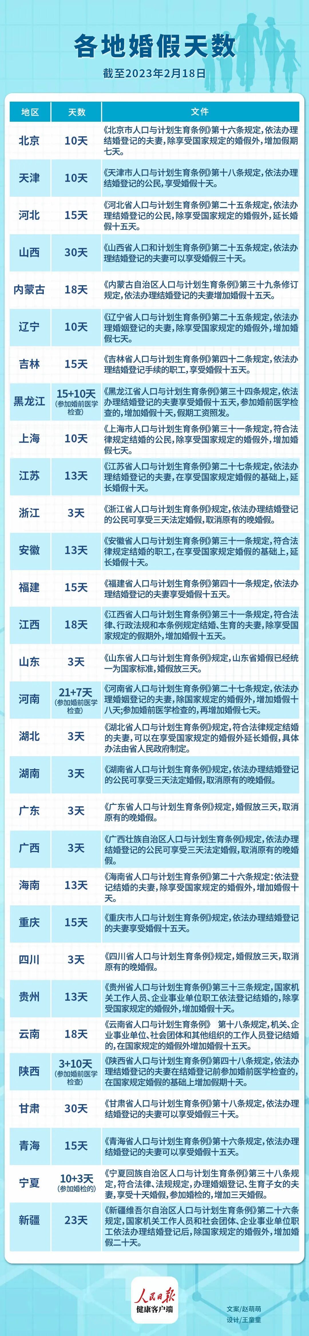 据人民日报健康客户端不完全统计,目前已有四川成都、江苏南京、天津、安徽、江西等多地明确延长婚假。其中甘肃、山西两省婚假最长达到30天。