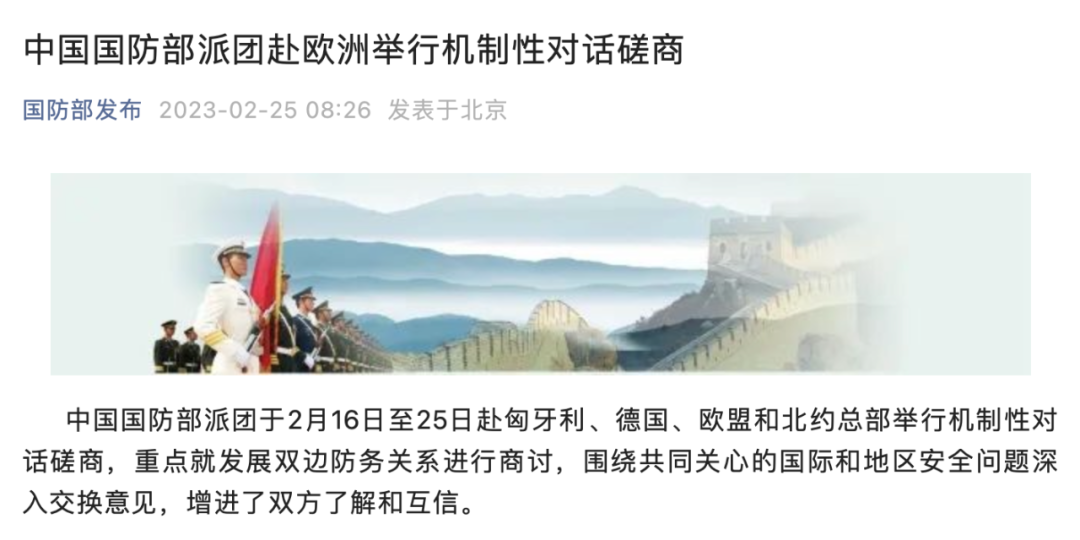 中国国防部派团于2月16日至25日赴匈牙利、德国、欧盟和北约总部举行机制性对话磋商,重点就发展双边防务关系进行商讨,围绕共同关心的国际和地区安全问题深入交换意见,增进了双方了解和互信。 来源:国防部发布