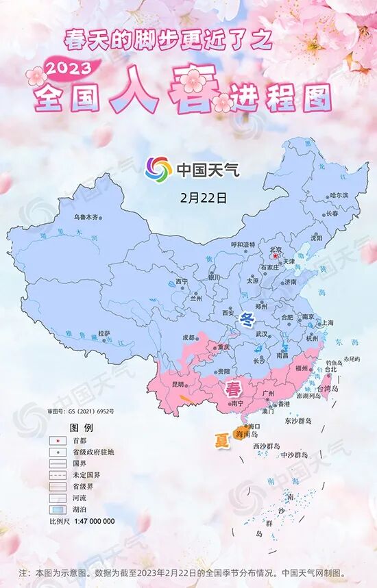 从2023年全国入春进程图来看截至目前,春天的脚步抵达浙江南部、江西南部、湖南南部广西北部、贵州南部以及四川东南部、重庆一带而在江南及其以北的大部分地区虽已春意萌动但离真正的春天还有些距离