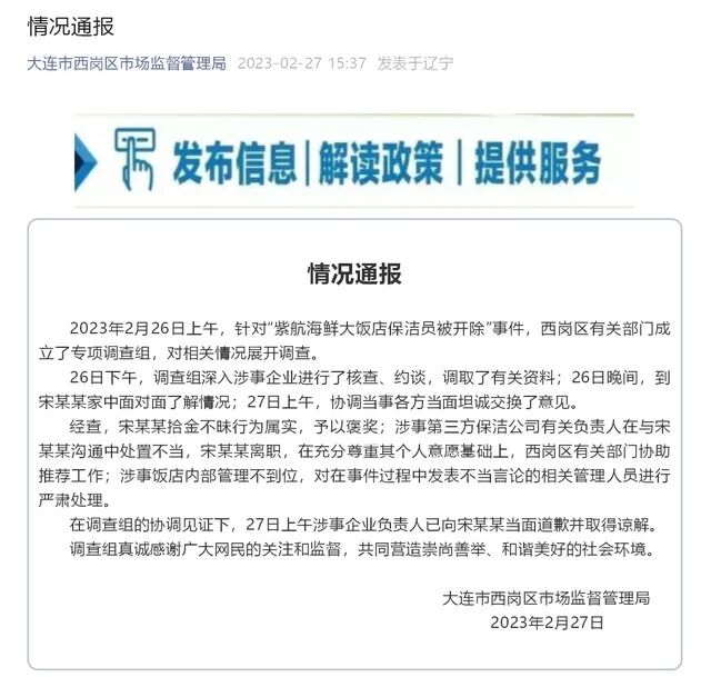 针对辽宁大连“紫航海鲜大饭店保洁员捡2万元报警被开除”事件,当地27日发布情况通报:被开除保洁员宋某某拾金不昧行为属实,予以褒奖;涉事企业负责人已向宋某某当面道歉。