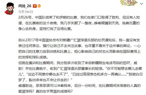 来源:中新体坛、周琦个人微博