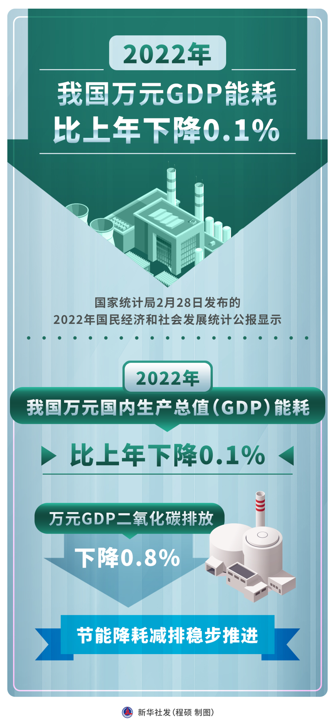 2022年我国万元国内生产总值(GDP)能耗比上年下降0.1%,万元GDP二氧化碳排放下降0.8%,节能降耗减排稳步推进。