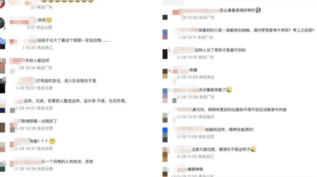 虽然距离视频发布已经过去了四天,网暴还在持续。2月28日傍晚,在某社交平台上,记者发现一则相关视频下方,仍有网友发表类似网暴言论:“最看不惯打鸡血的卷王了”“她是读书读魔怔了,看她表情”……