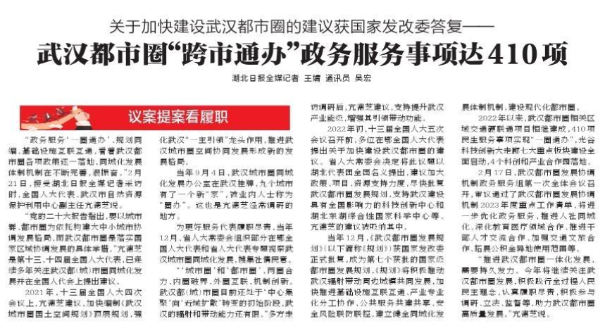 “政务服务‘一圈通办’、规划同编、基础设施互联互通,看着武汉都市圈各项政策逐一落地,同城化发展体制机制在不断完善,很振奋。”2月21日,接受湖北日报全媒记者采访时,全国人大代表、武汉市自然资源保护利用中心副主任亢德芝说。