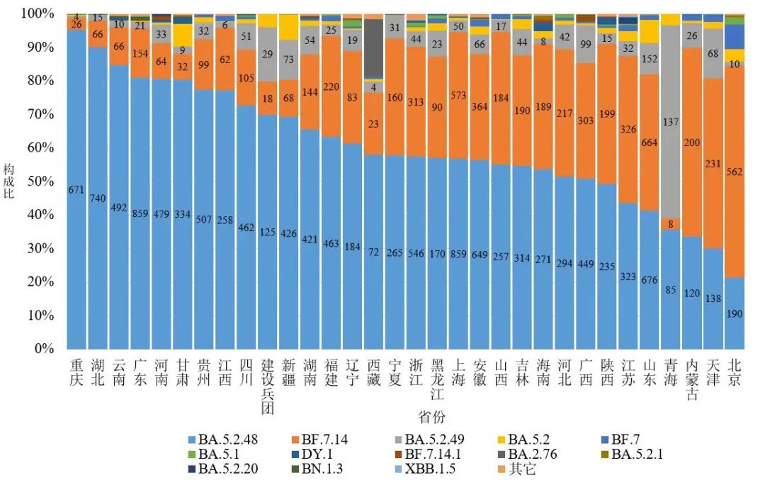 2.图中标记的数字分别为BA.5.2.48、BF.7.14和BA.5.2.49进化分支有效基因组序列数量;