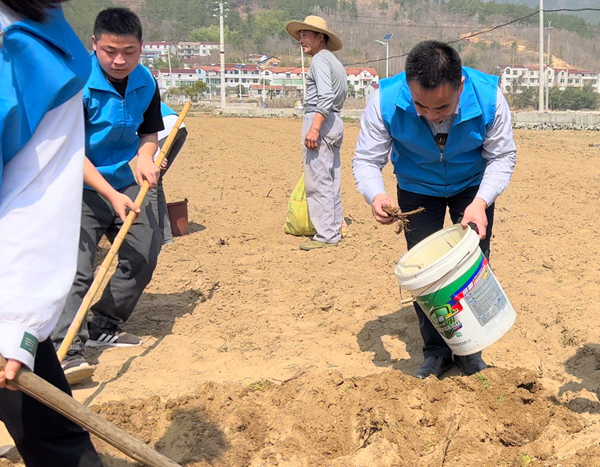 听取讲解后,刘东山拿起锄头,带领同学们走进田间地头,躬身示范,手把手指导学生挖坑、种植,开展了一次别具一格的“田间课堂”现场教学。挥动锄头中,师生们切身感悟到了田间劳作的艰辛和不易。