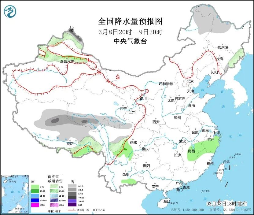 中央气象台预计,8日20时至9日20时,内蒙古东北部、黑龙江西北部、西藏南部、西北地区中部、川西高原北部等地部分地区有小到中雪,其中,新疆北疆北部等地部分地区有大到暴雪。西藏东南部、江南北部和东部、四川盆地西南部、四川南部、云南东南部等地部分地区有小雨,其中,四川盆地西南部和四川南部等地部分地区有中雨。