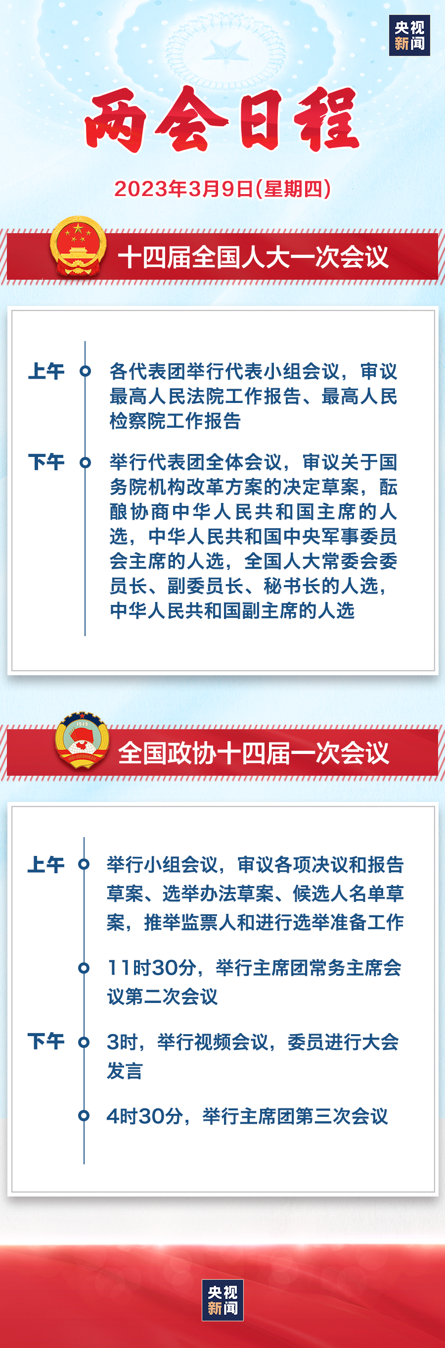 十四届全国人大一次会议第三次全体会议将于10日上午9时在人民大会堂举行。届时,中央广播电视总台将进行现场直播。