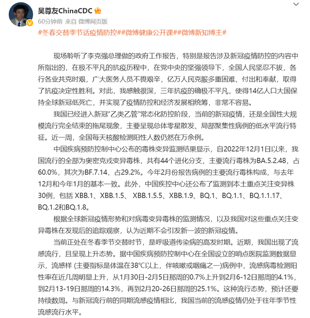 3月7日,中国疾控中心流行病学首席专家吴尊友发布微博称,我国已经进入新冠“乙类乙管”常态化防控阶段,当前的新冠疫情,还是全国性大规模流行完全结束的拖尾现象,主要呈现总体零星散发、局部聚集性病例的低水平流行特征。近一周,全国每天核酸检测阳性人数仍然在万余例。