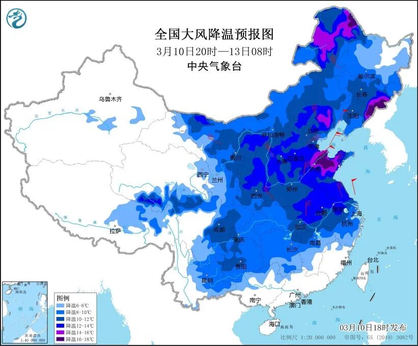中央气象台10日18时继续发布寒潮蓝色预警,受寒潮影响,预计10日20时至13日8时,中东部大部地区气温下降6~10℃,内蒙古、华北、黄淮、江淮东部等地气温下降12℃,局部超过16℃。