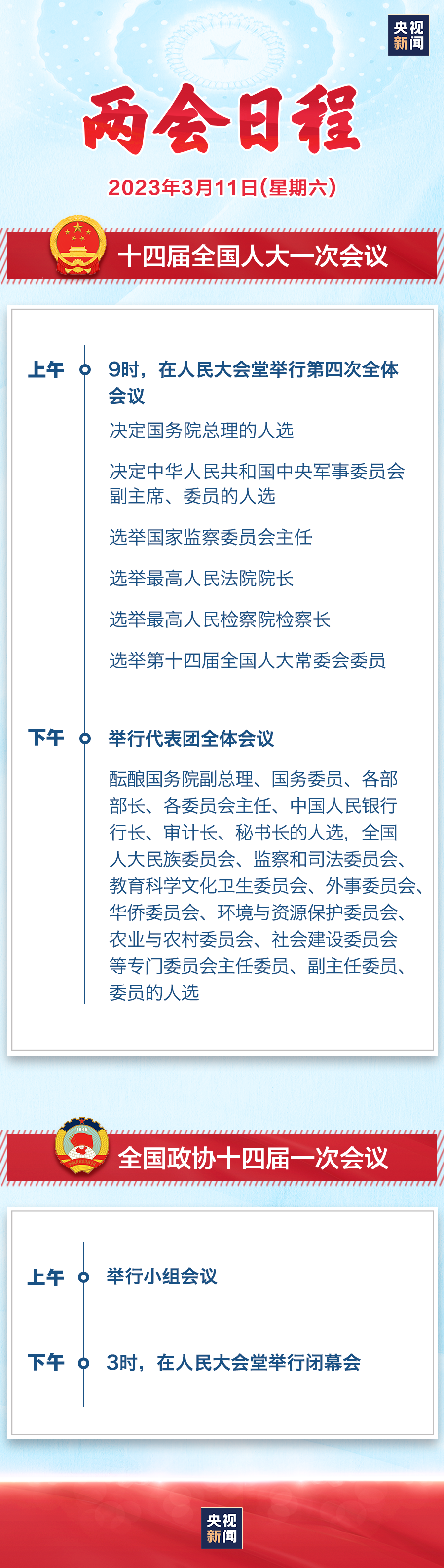 10日,全国政协十四届一次会议举行第三次全体会议,选出政协第十四届全国委员会领导人。中共中央政治局常委王沪宁当选全国政协主席,会议同时选出23位全国政协副主席。今天(11日)下午3时,全国政协十四届一次会议在北京人民大会堂举行闭幕会。届时,中央广播电视总台将进行现场直播。10日,俄罗斯总统普京等多国领导人致电或致函祝贺习近平当选中华人民共和国主席。
