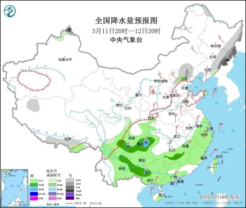 中央气象台预计,11日20时至12日20时,东北地区东部、新疆北疆北部、西藏南部、河北北部等地部分地区有小到中雪或雨夹雪,其中,黑龙江东南部、吉林东部、新疆北疆北部等地局地有大到暴雪。江南大部、西南地区大部、华南大部等地部分地区有小到中雨,其中,重庆南部、贵州东北部、云南东北部、广西西部等地部分地区有大雨。