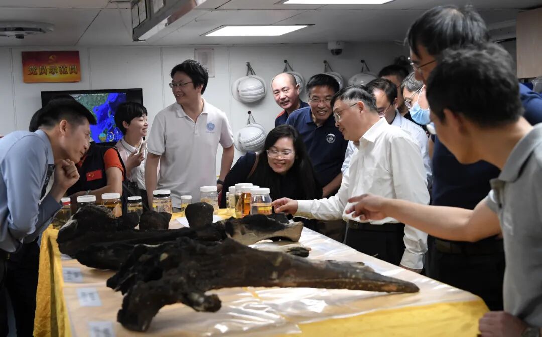 3月11日,“探索一号”科考船携“奋斗者”号全海深载人潜水器抵达三亚,科研人员在介绍采集的深渊宏生物、岩石、结核、沉积物样品。新华社记者 赵颖全 摄