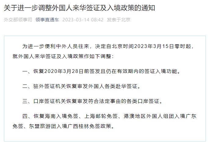 今天(14日),外交部领事司发布通告:为进一步便利中外人员往来,决定自北京时间2023年3月15日零时起,就外国人来华签证及入境政策作如下调整:
